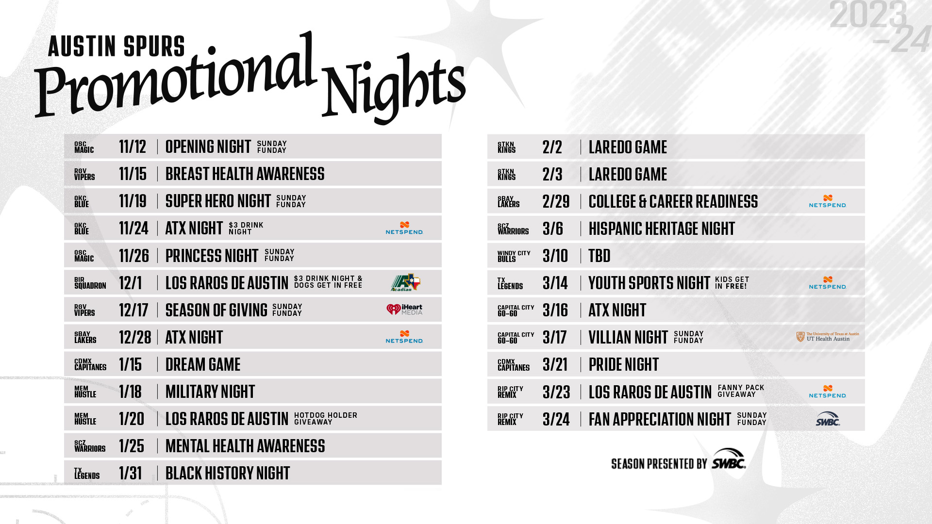 AUSTIN (Sept. 25, 2023) – The Austin Spurs today announced the team’s promotional schedule for the 2023-24 season, presented by SWBC. All 24 home games will feature a theme night that will help honor a variety of causes along with unique events for fans.